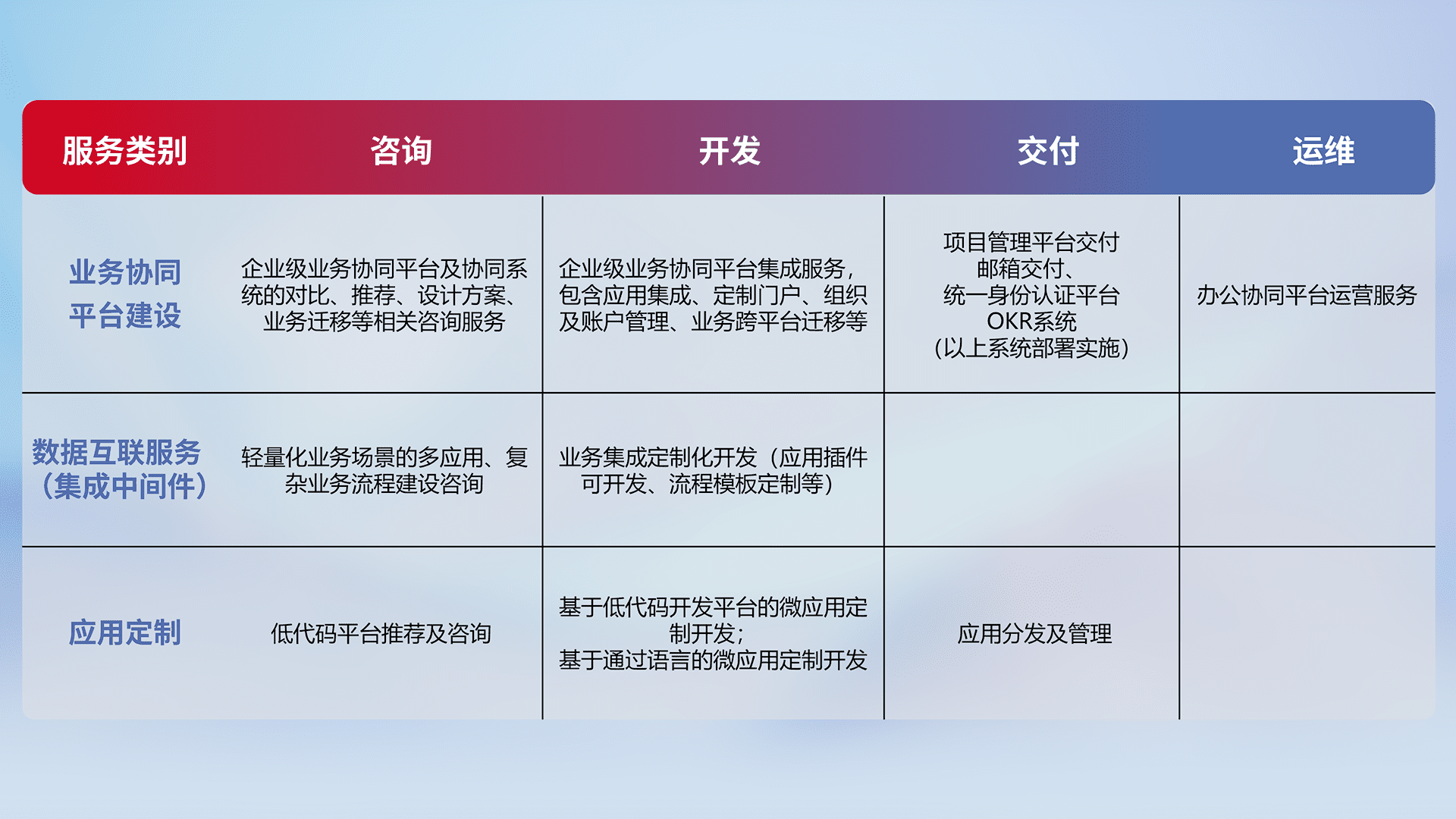 针对钉钉、、、企微、、、、IDaas等平台级产品提供产品的规划、、方案、、交付、、、、定制化开发等服务,,,,实现如统一协同办公、、智能客户服务、、、混合会议管理、、、、智能数据查询、、、等业务场景,,实现数字化转型。。